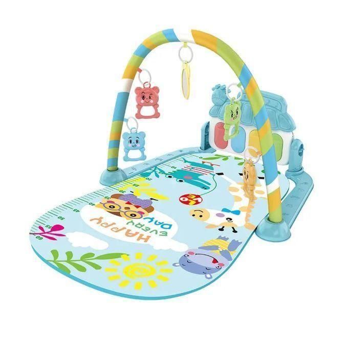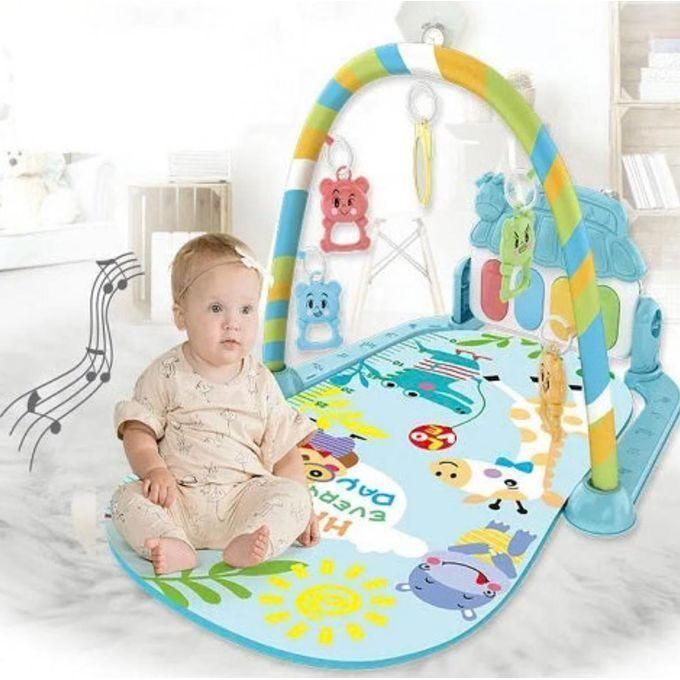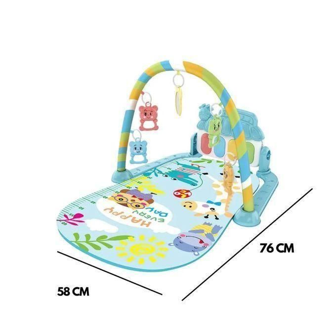 Tapis d’éveil coloré avec un piano à pédales intégré, conçu pour encourager l’exploration et la motricité chez les bébés.